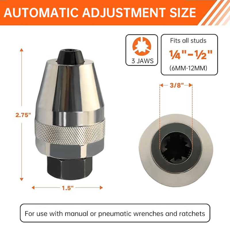 The three-jaw self-adjusting design can intelligently adjust the clamping force according to the size of the bolt, and firmly bite all kinds of rusty, slippery or broken bolts with sizes of 1/4 to 1/2 inches (6 to 12 mm), and pull them out easily, which will help you to efficiently complete the repair tasks, and significantly save time and costs.