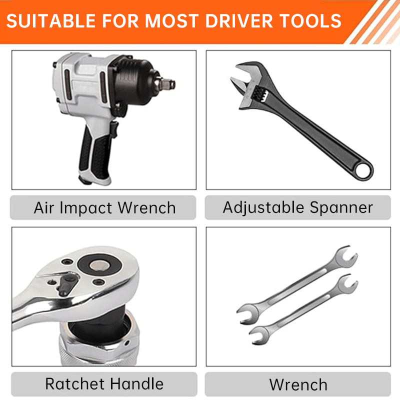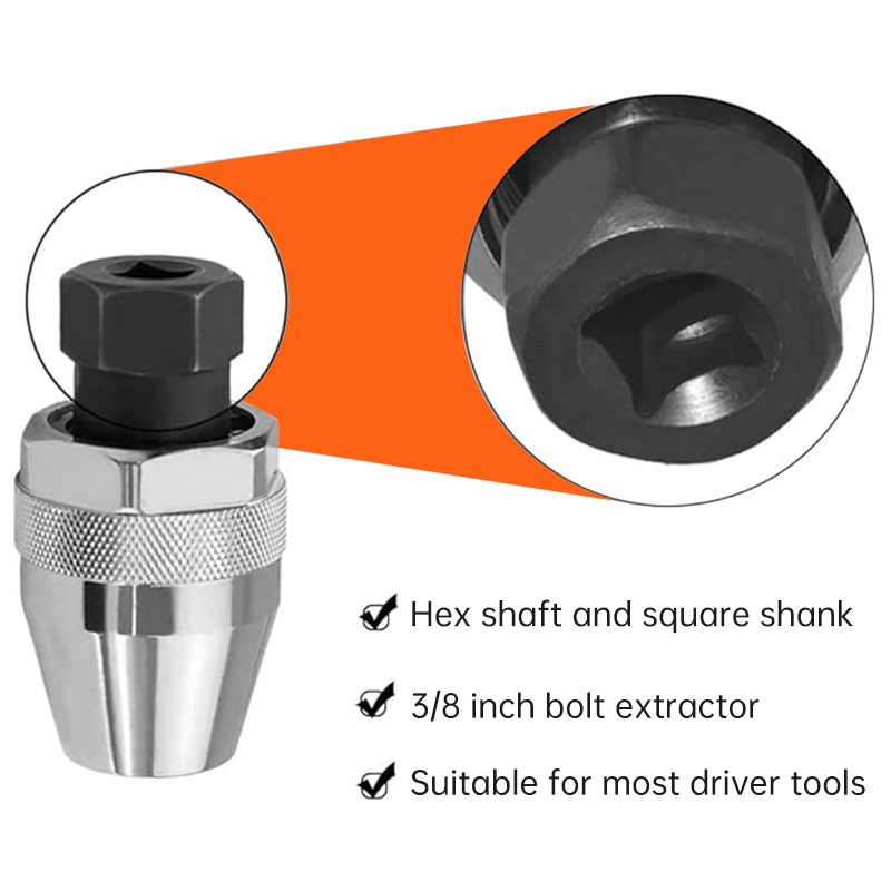 The 3/8-inch bolt extractor is compatible with most drive tools and can be used with manual or pneumatic impact wrench, ratchet wrench, as well as adjustable wrench and flat head wrench.